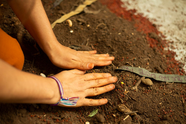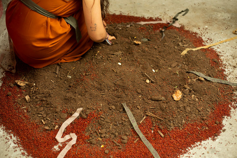 No centro de uma roda de terra e pisando em sementes de urucum, a artista desenrola sementes-poemas, semeando palavras entre os participantes, transmitindo a poesia e o cuidado. recita trechos de seus poemas (escritos em cordões de tecido) e rezas improvisadas, enquanto planta sementes em berços abertos na terra/chão. Ao entregar isso que é cultivado para as pessoas, a artista transfere o cuidado e a cria, abrindo perguntas sobre a plantação: Onde plantamos? Quais são as sementes e como fazê-las vingar? A qual terra pertencemos? O que fazer quando não vinga?